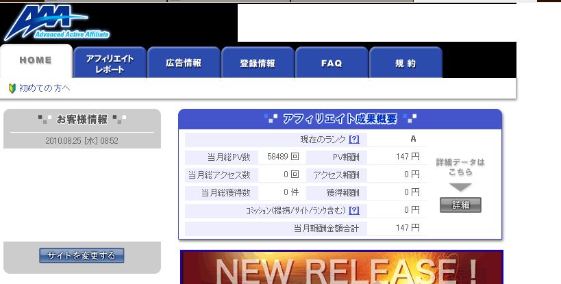 ギャンブルFX2010からAAAアフィリの当月25日現在PV報酬 147 円
